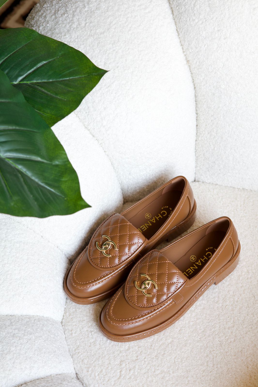 Chanel’s quilted leather loafers capture the essence of timeless Parisian elegance. Crafted from smooth brown leather, this classic design features the house’s signature diamond quilting on the vamp and a polished gold-tone CC turnlock for an iconic finish. The structured apron-toe silhouette is set on a low heel with a durable sole, ensuring comfort and versatility for everyday wear. A refined staple that transitions seamlessly from casual to polished looks.