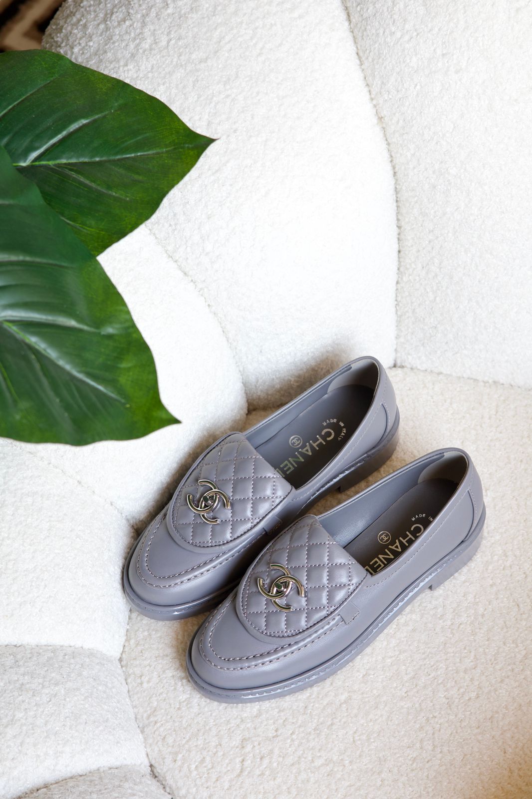 These Chanel loafers reflect the house’s timeless elegance with a modern touch. Crafted from smooth grey leather, they feature the iconic quilted pattern on the vamp and are finished with a polished CC turnlock detail. The classic apron-toe silhouette is complemented by a low stacked heel and a comfortable leather sole, making them ideal for all-day wear. Refined and versatile, these loafers elevate both casual and smart ensembles with unmistakable Chanel sophistication.