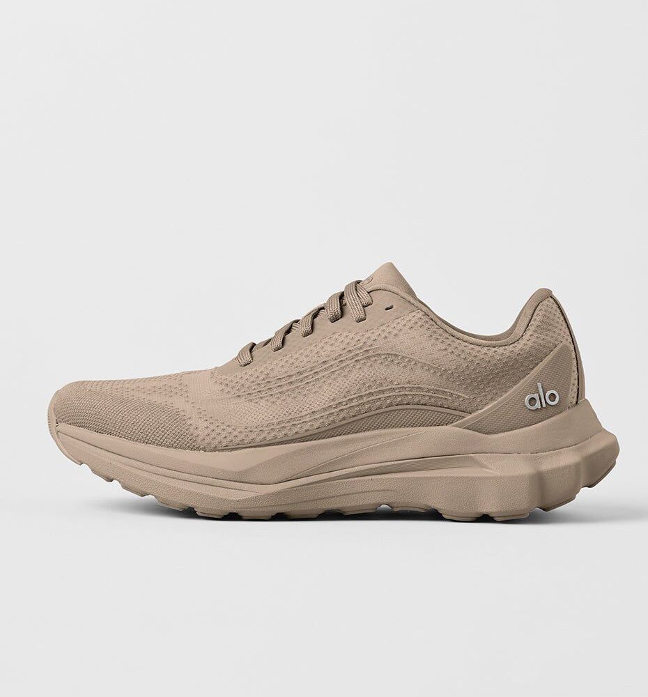 Neutral beige Alo sneakers with breathable knit upper and cushioned sole, designed for lightweight comfort and modern everyday style.